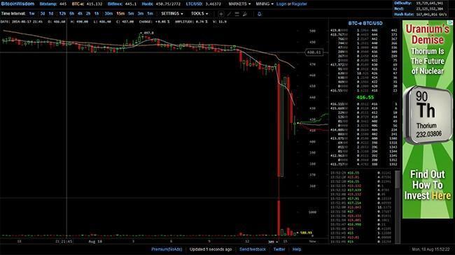 Ağustos ayının başından bu yana Bitcoin fiyatında gözlenen düşüşlerin en büyük yankı uyandıranı, bugün öğleden sonra BTC-e borsasındaki düşüş oldu. 15 dakika içerisinde 7000 BTC’lik işlem hacmi ile Bitcoin fiyatı 309 dolar seviyesine kadar düşüş gösterdi.