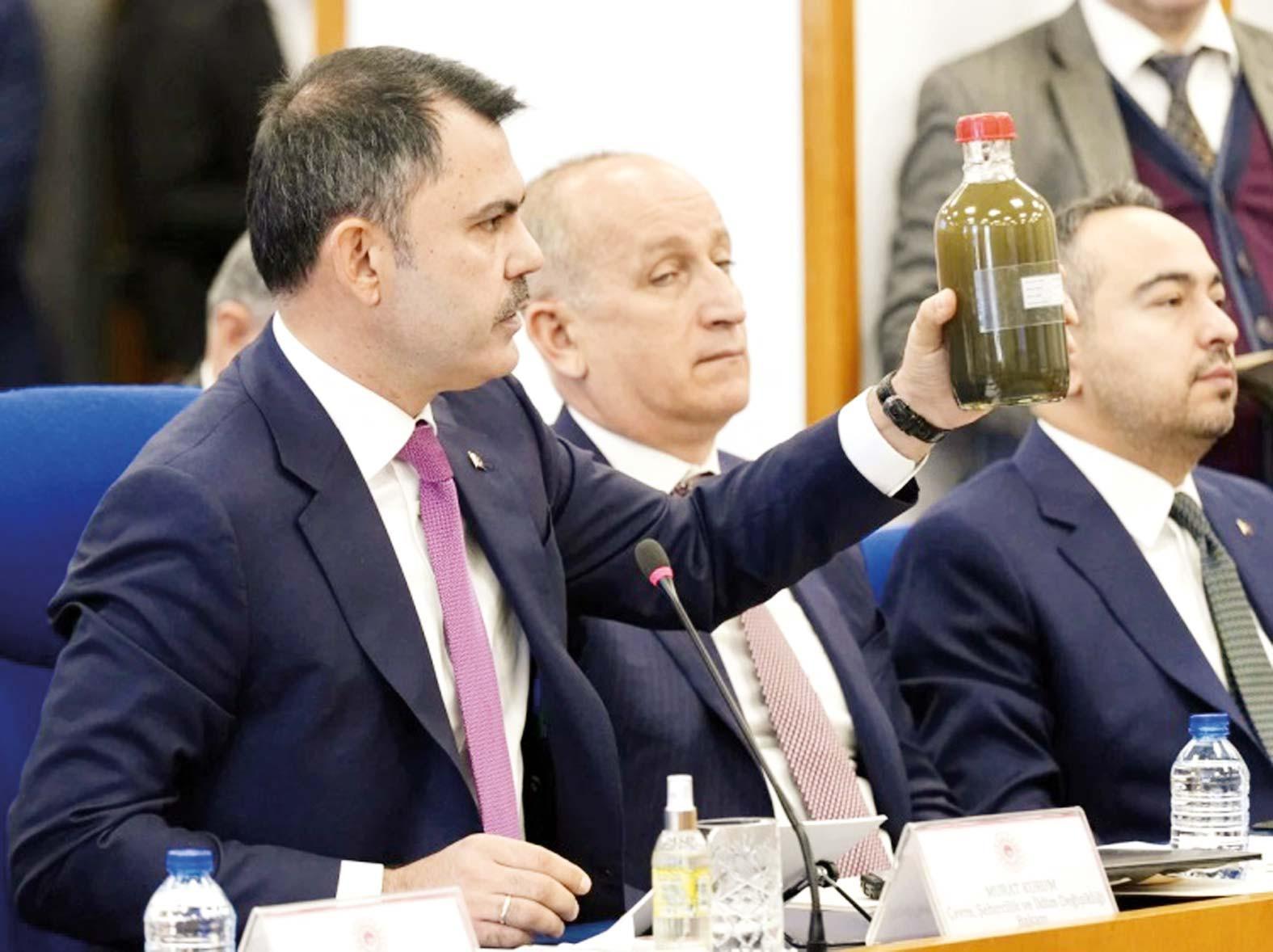 “Numuneyi Ergene’den mi aldınız Marmara’dan mı, Dicle-Fırat bok akıyor” tepkilerinin üzerine komisyon görüşmelerine ara verildi. Aranın ardından Kurum, “Bu suyu, İzmir Körfezi’ndeki kirliliği görmekten imtina eden, bu acı tablo karşısında tek bir açıklama dahi yapmayan siyasilere kirliliği daha iyi anlatmak için getirdim. Artık İzmir Körfezimizde büyük bir çevre felaketi yaşandığını, her saat başı binlerce balığın öldüğünü görmenin vakti gelmiş, hatta geçmiştir. Bu su numunesi içerisinde, atık su kaynaklı amonyak miktarı, olması gerekenden tam 50 kat daha fazladır. Oksijen seviyesi sıfırdır sıfır” sözlerine muhalefetten “Balıkları düşünüyorsun ama birinci derece sorumlu olduğun, 9 işçinin hayatını kaybettiği İliç’ten tek kelime bile söz etmiyorsun” tepkisi yükseldi.