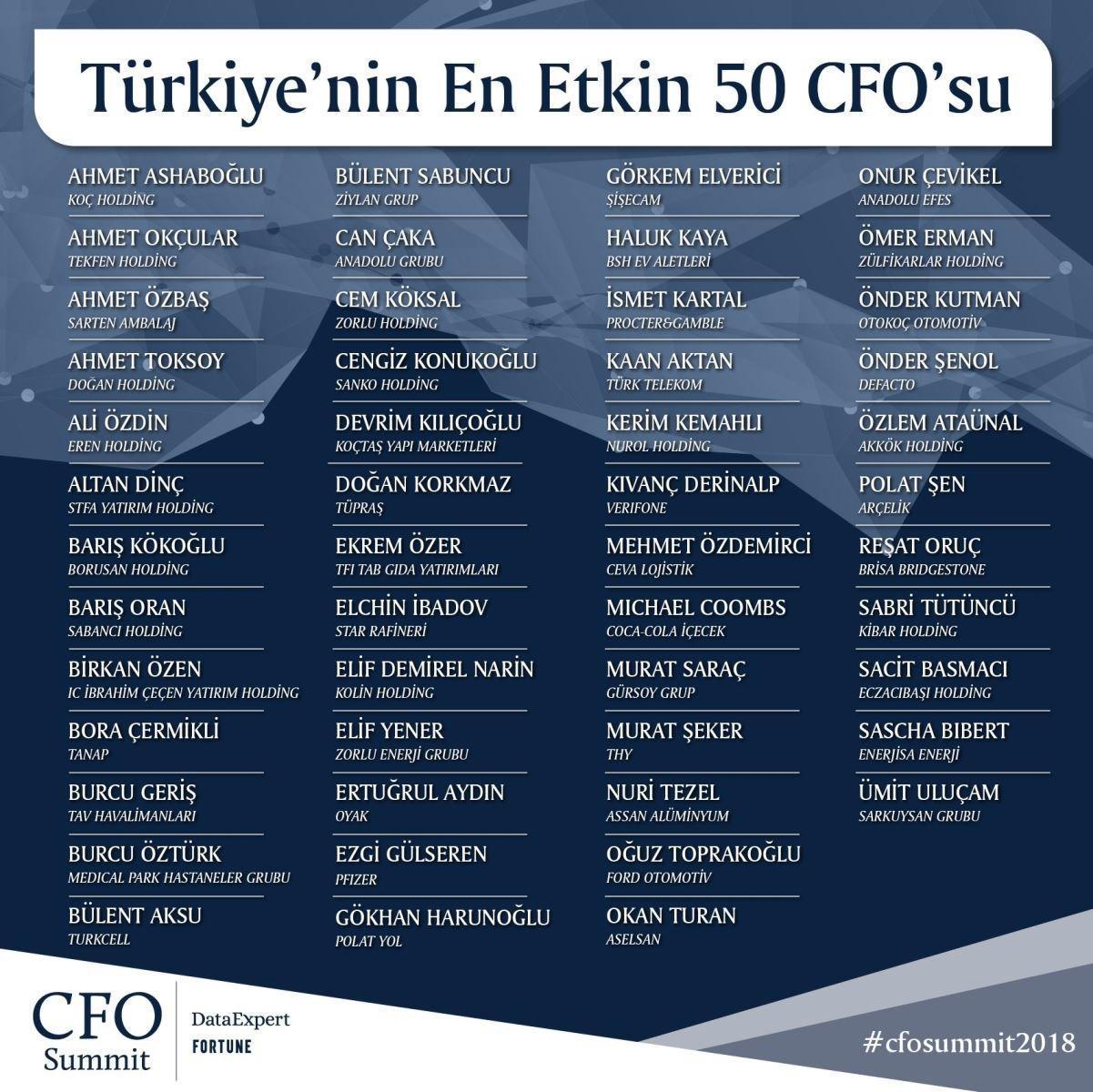 İşte DataExpert ve Fortune iş birliğiyle hazırlanan “En Etkin 50 CFO” listesinde yer alan, Türkiye iş dünyasının başarılı isimleri… (Sıralama alfabetiktir.)