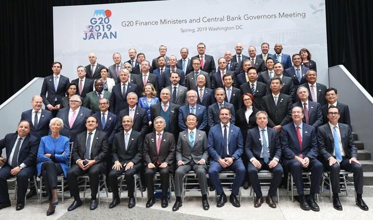 Fotoğraf çekiminde, Türkiye Cumhuriyet Merkez Bankası (TCMB) Başkanı Murat Çetinkaya'nın yanı sıra ABD Hazine Bakanı Steven Mnuchin ve IMF Başkanı Christine Lagarde da hazır bulundu.