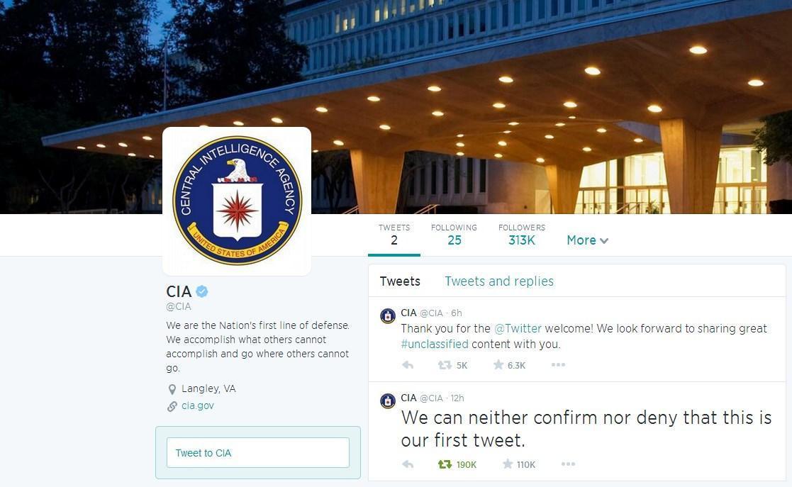 ABD merkezi istihbarat teşkilatı CIA, Twitter hesabı açtı. Kısa sürede 312 bin kullanıcı tarafından takibe alınan @CIA hesabından atılan ilk tweet de olay oldu.