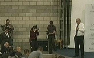 IMF başkanı Dominique Strauss-Kahn`a Bilgi Üniversitesi`ndeki konuşması sırasında, Anadolu Üniversitesi öğrencisi Selçuk Özbek tarafından fırlatılan ayakkabı polis tarafından üniversiteden çıkarılırken ayağına yeniden giydirilidi.
