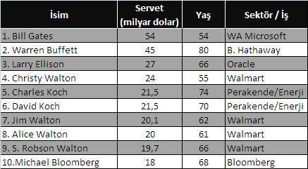Listenin ilk 10`unda yer alanların toplam serveti 270,8 milyar dolar değerinde bulunuyor.