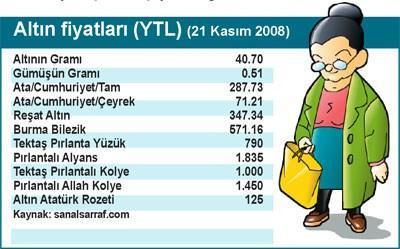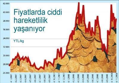 Çünkü dünyada altın fiyatı bir yılda gerilerken bizde dolar fiyatı arttı. Geçen yıl kasımın üçüncü ‘cuma’sında dolar 1.20 YTL iken, geçen cuma 1.63 YTL olmuştu.