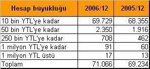 Aralık 2006 itibariyle 10 bin YTL`nin altında 69 milyon 729 mudi var. 50 bin YTL`ye kadar hesabı olanların sayısı 2.3 milyon, 50 bin ile 250 bin YTL arasındaki mudi sayısı 708 bin ve 250 ile 1 milyon YTL arasında hesabı olanların sayısı da 91 bin. 1 milyon YTL`nin üzerinde hesabı olan 17 bin mudi var.