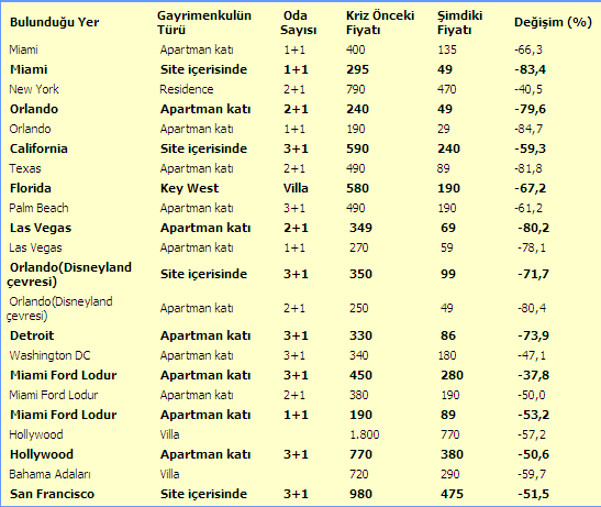 Bunun dışında yine konut fiyatlarındaki düşüşün en fazla olduğu bir başka yer ise Florida eyaletinin ünlü tatil beldesi Miami. Örneğin; Miami’de denize yakın site içerisinde yer alan 1+1 şeklindeki bir dairenin fiyatı, kriz öncesinde 295 bin dolarken aynı dairenin şu anki fiyatı 49 bin dolara kadar inmiş durumda. Yine Florida’nın bir başka tatil beldesi olan Key West’te kriz öncesi 580 bin dolar istenen bir villa, şu anda 240 bin dolara alıcı bekliyor.